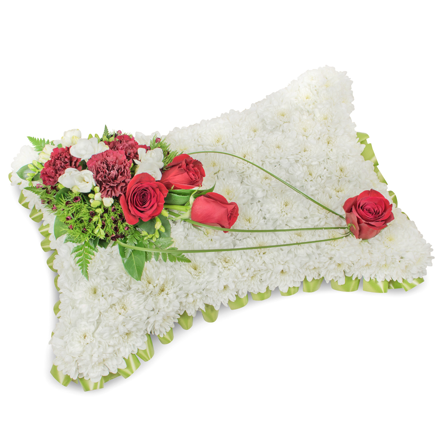 Express your condolences with our sophisticated bouquet, featuring white chrysanthemums, red roses, white freesias, dark red carnations, dianthus, and bear grass. This elegant combination is designed to convey your deepest sympathies.